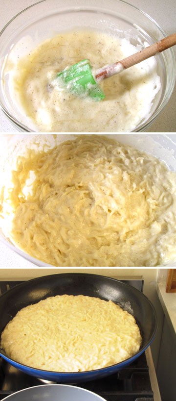 תמיד כאשר לאמי נותרו איטריות שהכינה במיוחד למרק, היתה מערבבת עם ביצים, מעט מלח ופלפל ומטגנת במחבת וכך עד היום. ואני כבת נאמנה מכינה דברים רבים מתוך הרגל ומבלי משים אפילו ממאכליה של אמא. החלטתי שהפעם לעומת ההכנה הרגילה אקציף את הביצים ויצא אומלט תפוח ואוורירי יותר וכך עשיתי. יצא כמובן נהדר ומעט יותר אוורירי בגלל ההקצפה. אך אם תרצו טעם מתפצפץ יותר בפה אל תקציפו ופשוט ערבבו את הביצים פנימה, כך או כך טעים. תוכלו להכין את אותו המתכון בתוספת גבינה מגוררת ופטרוזיליה ואם תבחרו במתוק הוסיפו מרכיבים כגון צימוקים ואף מעט גבינה כחושה ויותר סוכר.