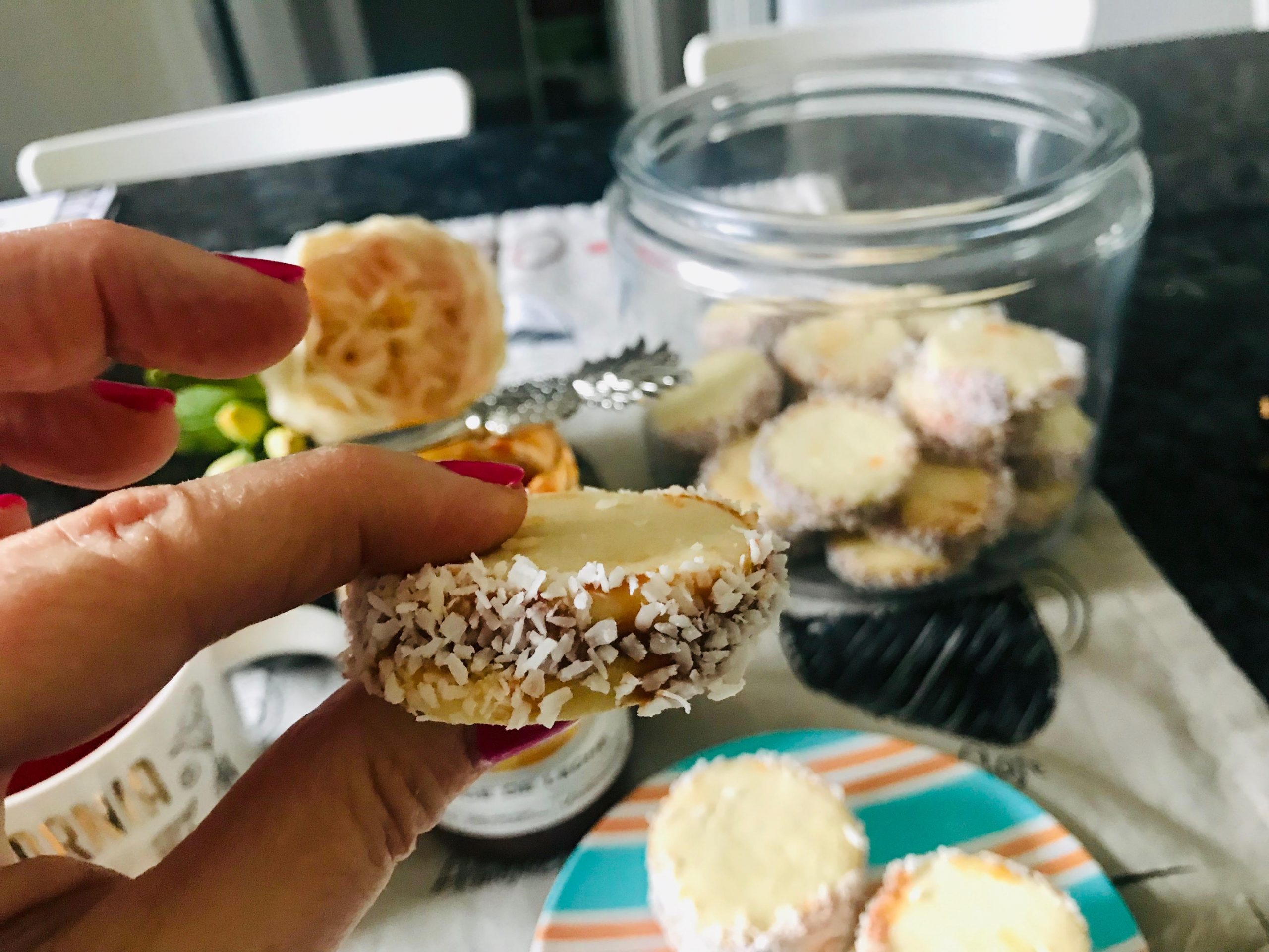 העוגיות תפוחות וממתינות למילויין בריבת החלב וטבילתן בקוקוס