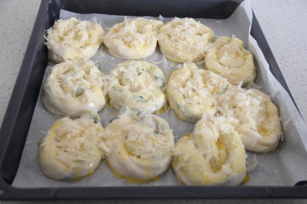 8. מסובבים לשבלול ומניחים בתבנית תנור מרופדת בנייר אפייה.