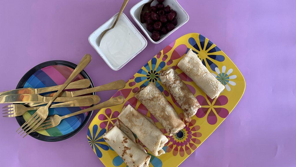 בלינצ'ס מתוקים במלית גבינה וציפוי שמנת חמוצה ודובדבנים