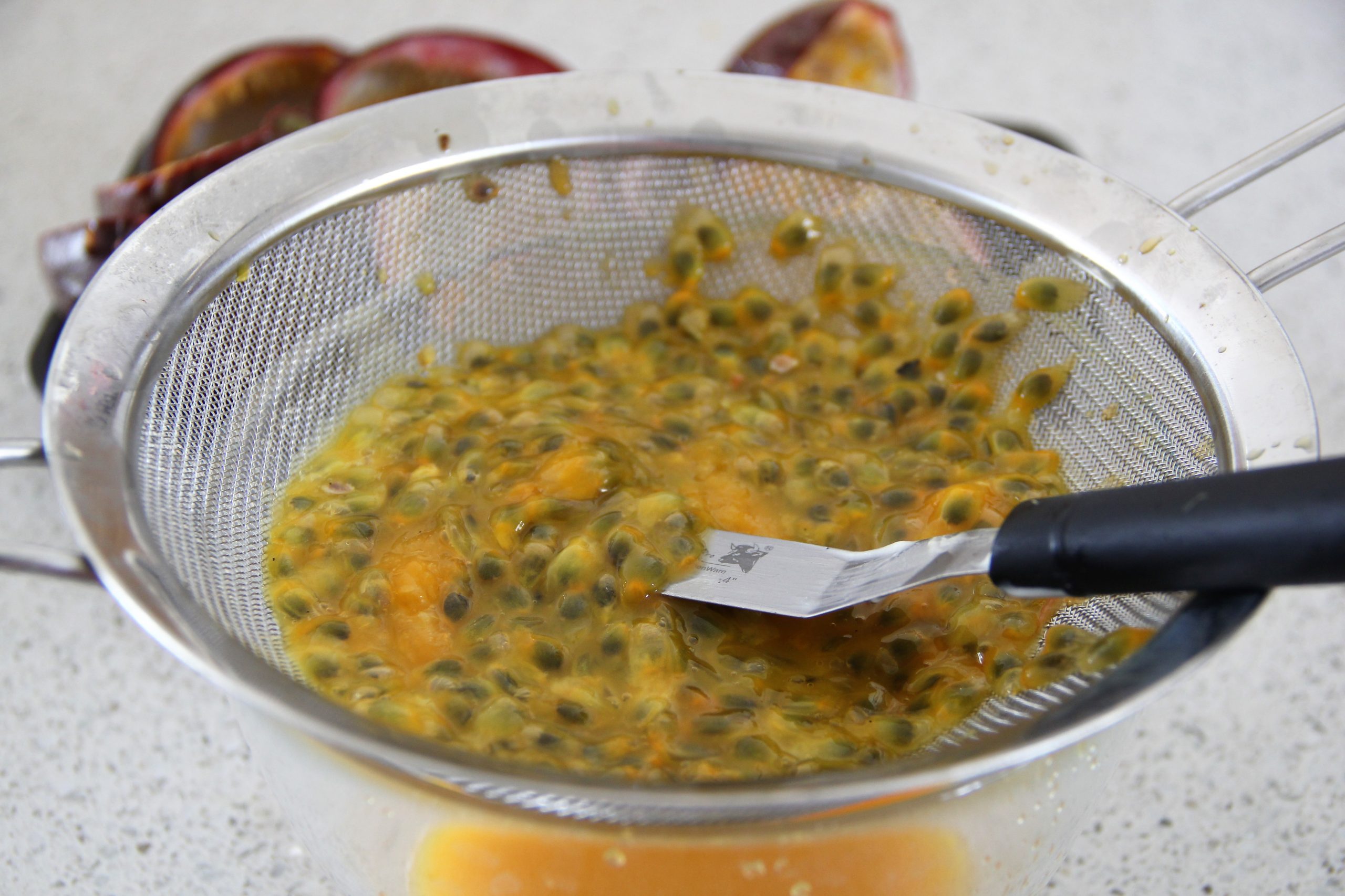 מסננים את הפסיפלורה מהגרעינים (שומרים 2 כפות מהגרעינים בצד) ומערבבים עם הסוכר, מעבירים לקלחת ומחממים עד המסת הסוכר.