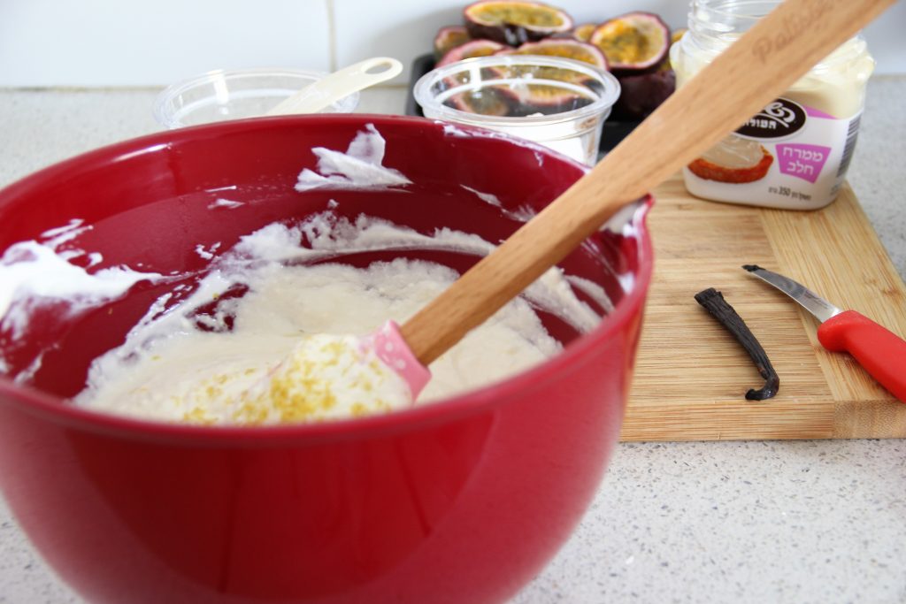 מערבבים את הגבינה, שמנת חמוצה, ממרח חלב, משחת וניל, גרד לימון.