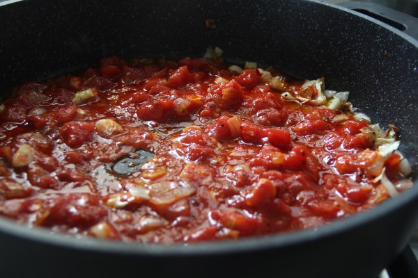 3. מוסיפים את העגבניות המרוסקות, מתבלים בסוכר, מלח , לימון והפסטו. מערבבים ומרתיחים לרתיחה.