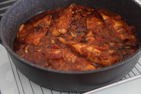 4. מוסיפים אל הרוטב הרותח את הדגים ומכסים אותם ברוטב בעזרת כף וכאשר כל הדגים מכוסים ברוטב סוגרים במכסה ומבשלים על אש בינונית נמוכה כ-15 דקות. מנערים קלות את סיר הדגים.