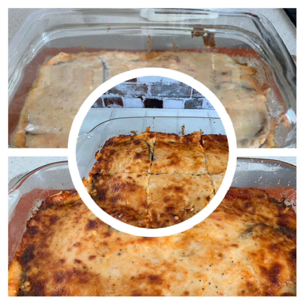 בקולאז' זה רואים את הלזניה לפני ואחרי האפייה, הצבע הבהיר אפרפר משהו לפני ולאחר מכן הצבע הזהוב