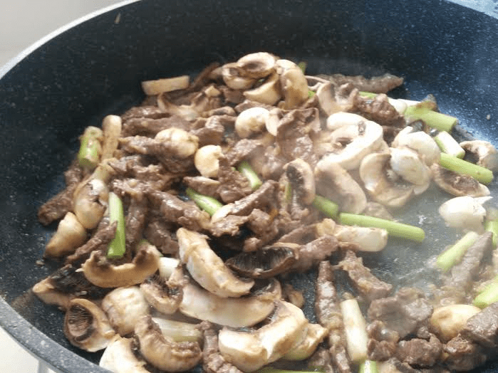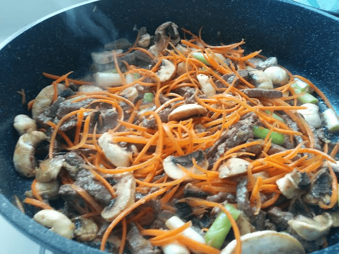 -מחממים מחבת גדולה נון סטיק ומוסיפים את רצועות השייטל, מערבבים כ-4 דקות ומוסיפים את השום והג'ינג'ר, בצל, פלפלים והפטריות ומערבבים.