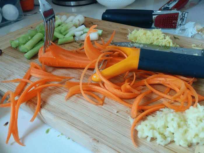 -חותכים את גבעולי הבצל, קולפים את הגזרים לג'וליאנים (רצועות דקות), פורסים את הפטריות ואת הפלפלים.
