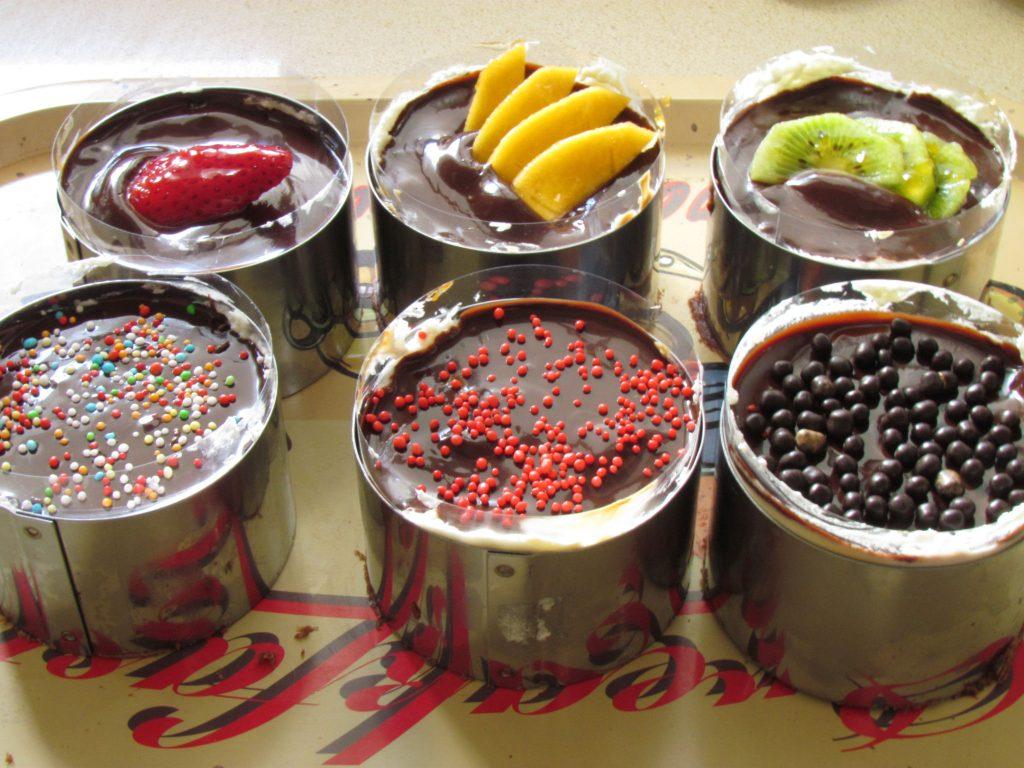 והנה להוכחת דעתי הכנתי מוס בעל שתי שכבות מוס ובתחתית בסיס של עונג שוקולדי מעולה ומעל המוסים עטיפת גנאש. ולסיום החגיגה קישטתי בפירות העונה כתותים, אפרסמון, קיוי וכן בסוכריות צבעוניות ועיגולי וואפלים בציפוי שוקולדי.