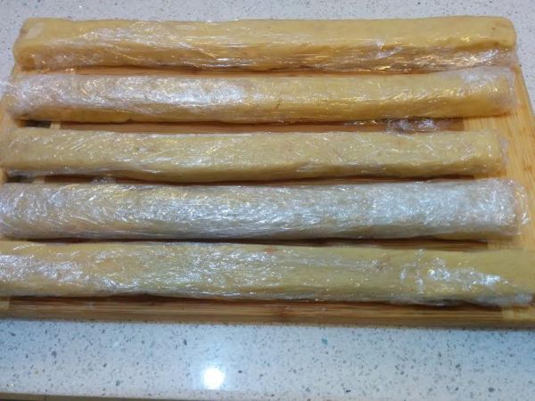 -מניחים כל נקניק על ניילון נצמד, מעבדים עם האצבעות למלבן מאורך ועוטפים עם הניילון.