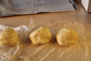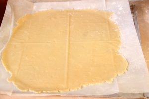 - מחממים תנור ל-190. מחלקים את הבצק לשלושה חלקים שווים ומרדדים כל חלק על נייר אפייה מאובק בקמח, מניחים כדור בצק ומרדדים על פני התבנית. כך עם כל כדורי הבצק.