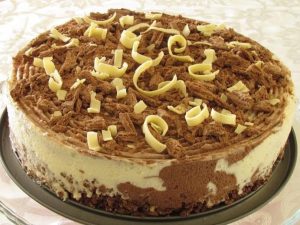 - למחרת מפזרים מעל שוקולד מקופלת ותלתלי שוקולד לבן שחומם מעט וגולף עם קולפן.
