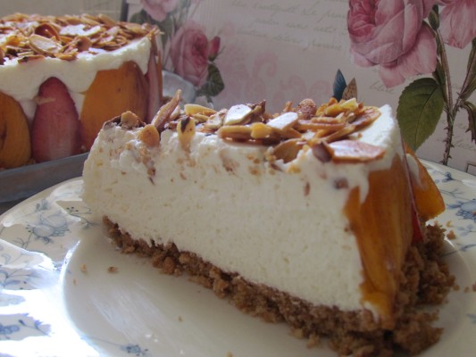 עוגת מוס גבינה פירות ושקדים מקורמלים