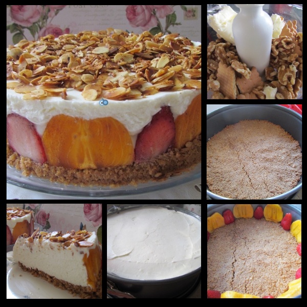 לעוגת גבינה קרה יש מספר יתרונות. היא טעימה בצורה בלתי רגילה, יפה מאוד לכן הולמת במיוחד להכנה לאירועים חגיגיים. הפעם בנוסף לקישוטי הפירות הוספתי שבבי שקדים מקורמלים בחמאה, דבר שהוסיף לטעם.