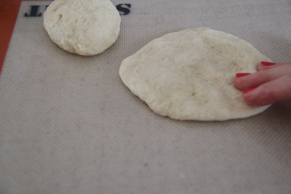 7- מכדררים כל חתיכה ופותחים עם הידיים על משטח העבודה לעיגול.