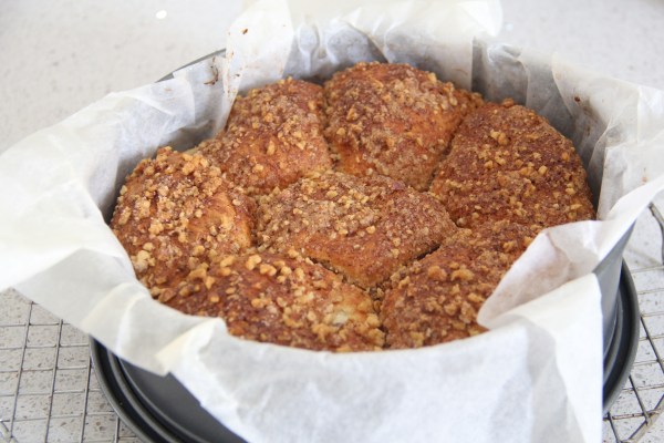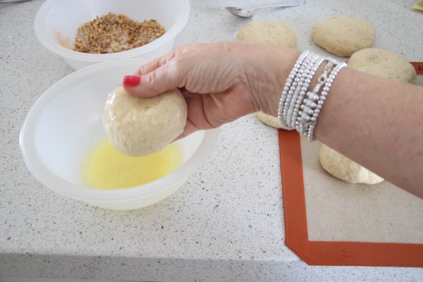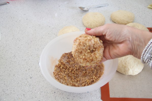 טובלים את הכדור בחמאה המומסת ולאחר מכן בתערובת האגוזים