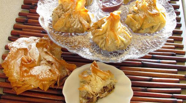 בחרתי לשתף בווריאציה בה השימוש הינו בעלי פילו, אותם אני ממלאת במלית עוף, שפע פיצוחים קצוצים, סוכר וקינמון לפי הטעם (לכן אין כמויות), אוגדת לשקיקים ואופה עד להזהבה מתפצפצת. השקיקים מקבלים איבוקי אבקת סוכר וקינמון והמראה והטעם מושלמים. נתתי גם את האפשרות של הסגירה בצורת סיגרים.