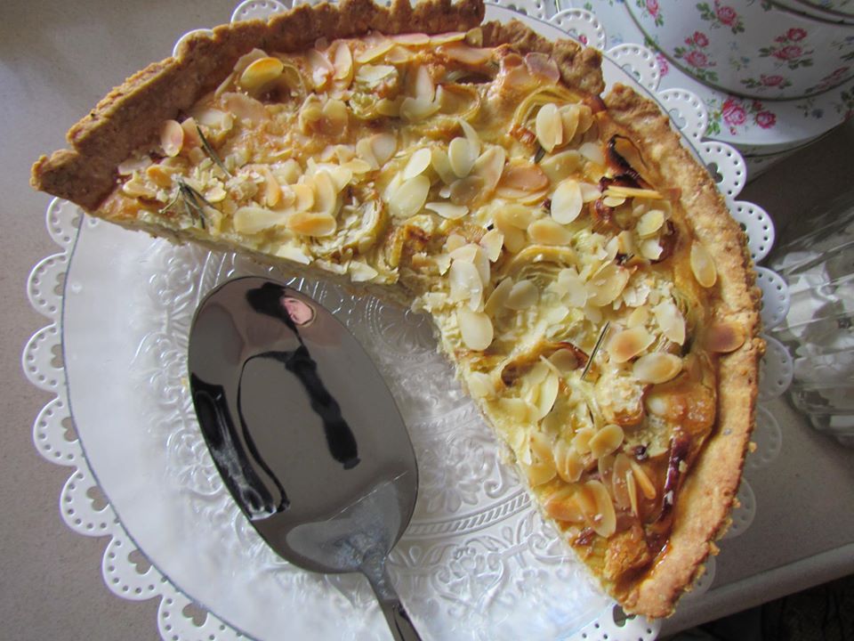 - מוציאים מהתנור, מפזרים מעל את הכרישה והבצל, יוצקים את הרויאל, מפזרים מעל את שבבי השקדים ומניחים את גבעול הרוזמרין.