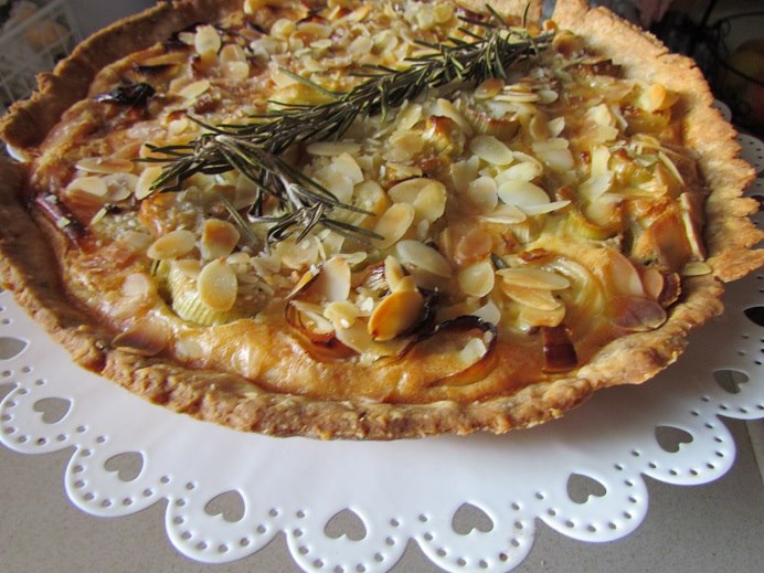 קיש כרישה עם בצק פריך משולב פרמזן ומעל מלית טעימה במיוחד של כרישה, חמאה ושבבי שקדים