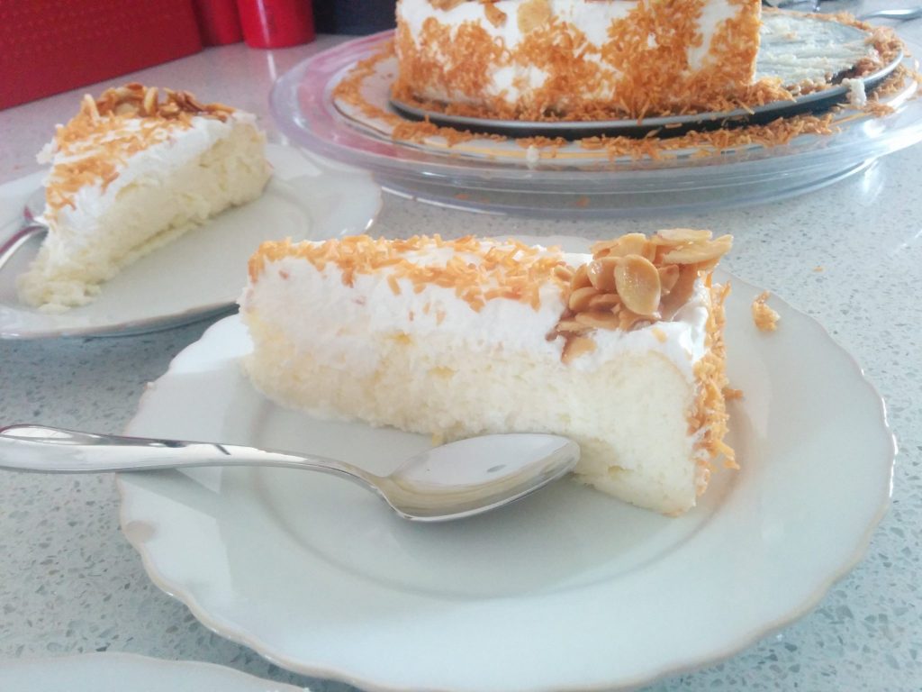 עוגת גבינה אפויה וקלילה במרקמה עם מעט סוכר וגבינה רזה. בעת אכילתה תחילה נתקלים בקרנצ'יות של השקדים והקוקוס ובהמשך ברכות הנעימה של בגבינה