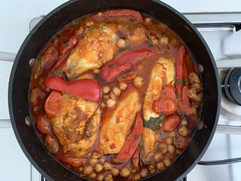 פילה דג ברוטב פלפלים וגרגירי חומוס ועגבניות שרי טריות, חמצמץ חריף בטעם מושלם