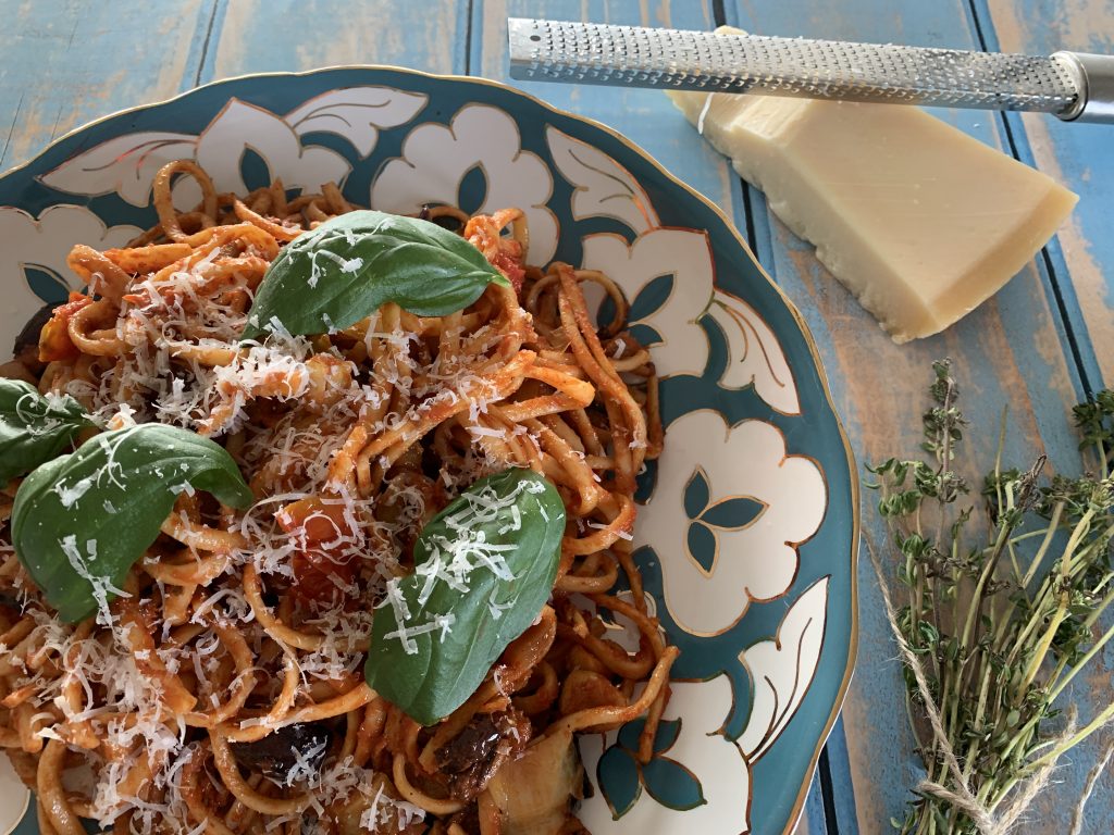 פסטה לינגוויני ברוטב עגבניות, חציל, ארטישוק, וזיתיםפסטה לינגוויני ברוטב עשיר של עגבניות שרי, חציל, לבבות ארטישוק וזיתי קלמטה, מנה סופר טעימה