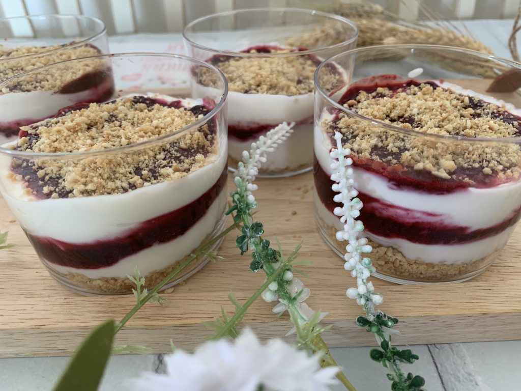 קינוח גבינה ופירות יערקינוח שכבות בכוס עם פירורי ביסקוויט, גבינה ורוטב פירות יער, מהיר, אלגנטי וטעים במיוחד