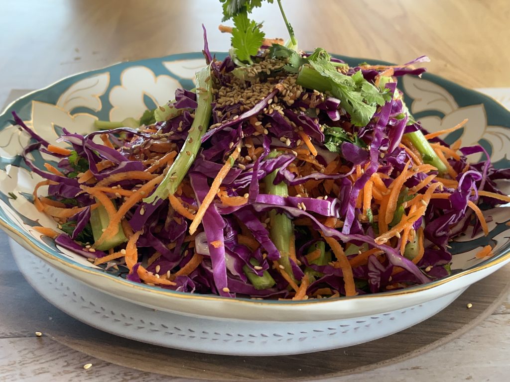 סלט כרוב וגזר אסיאתי, בתוספת פלפלים, סלרי שומשום קלוי ורוטב חמצמץ