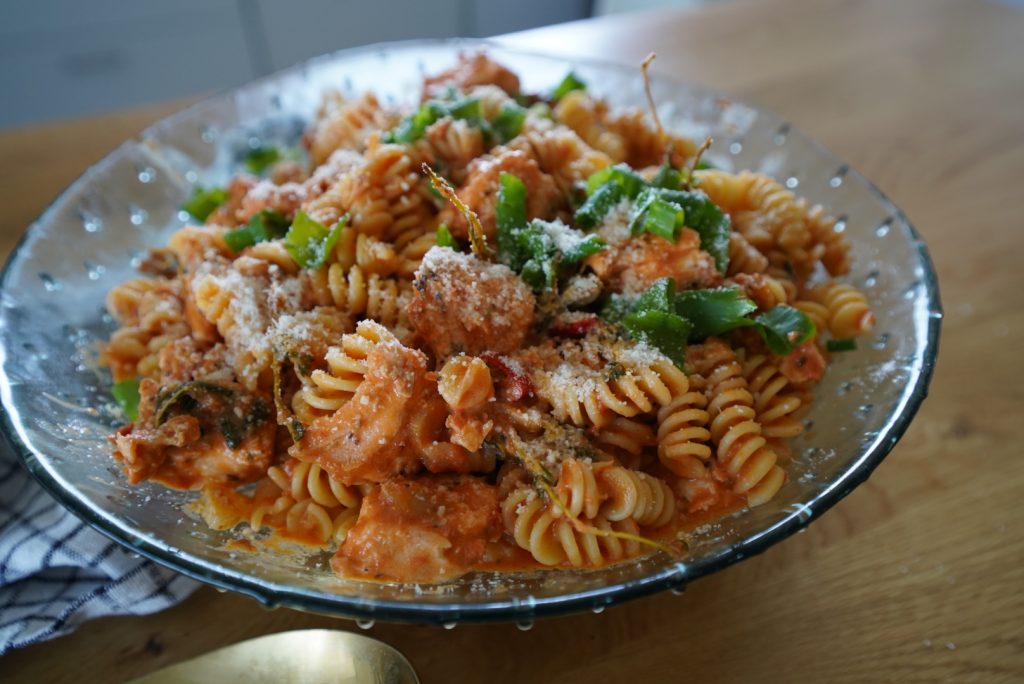 פסטה פרפלה עם קוביות סלמון ורוטב עגבניות שמנת
