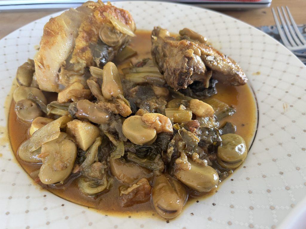 עוף עם פולים, חצילים ומנגולד