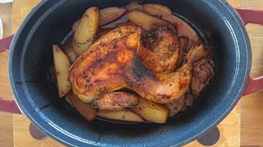 עוף שלם בסיר יצוק ברזל בתנורעוף שלם אפוי בתנור בסיר ברזל, דבר המעניק לו השחמה מדהימה וטעם מקורמל מתקתק