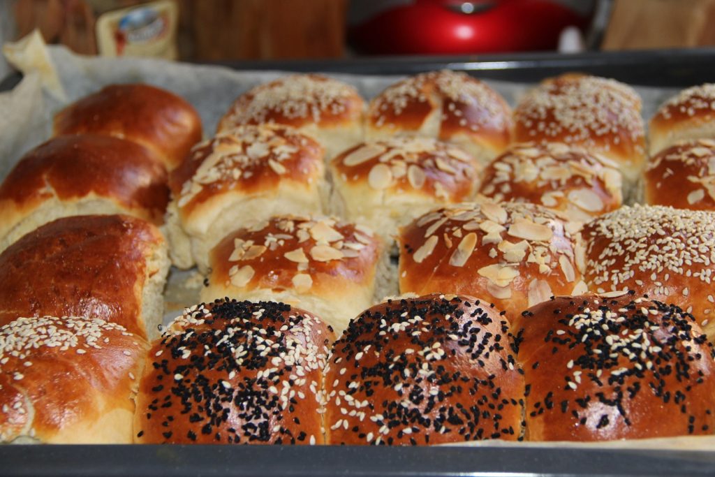 לחמניות מתוקות ורכות מעוטרות בשומשום, פרג ושבבי שקדים, המונחות בתבנית בצמידות ולכן הן נדבקות זו לזו ותופחות לגובה