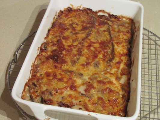 מוסקה המורכבת משכבות חציל, בטטה ובין השכבות רוטב בשאמל ומעל הכל ציפוי קריספי