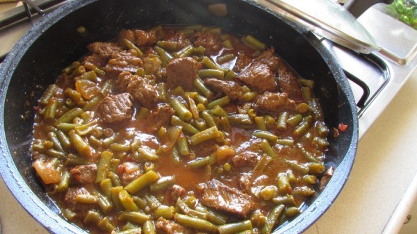 קוביות בשר כתף רכות מבושלות עם שעועית ירוקה והכל שוחה ברוטב אדמדם עסיסי