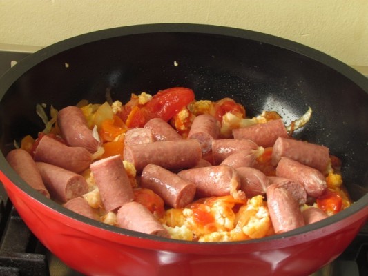 קדירת נקניקיות וגרגירי חומוס, מנה מהירת הכנה וטעימה שאפשר להגיש עם אורז או פירה