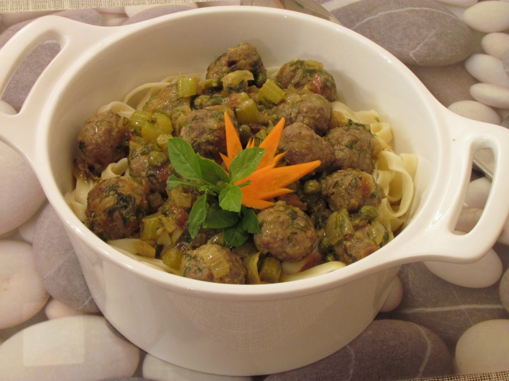 פסטה רחבה עטופה ברוטב ומוגשת עם כדורוני בשר, סלרי ועשבי תיבול. מנה משביעה וטעימה