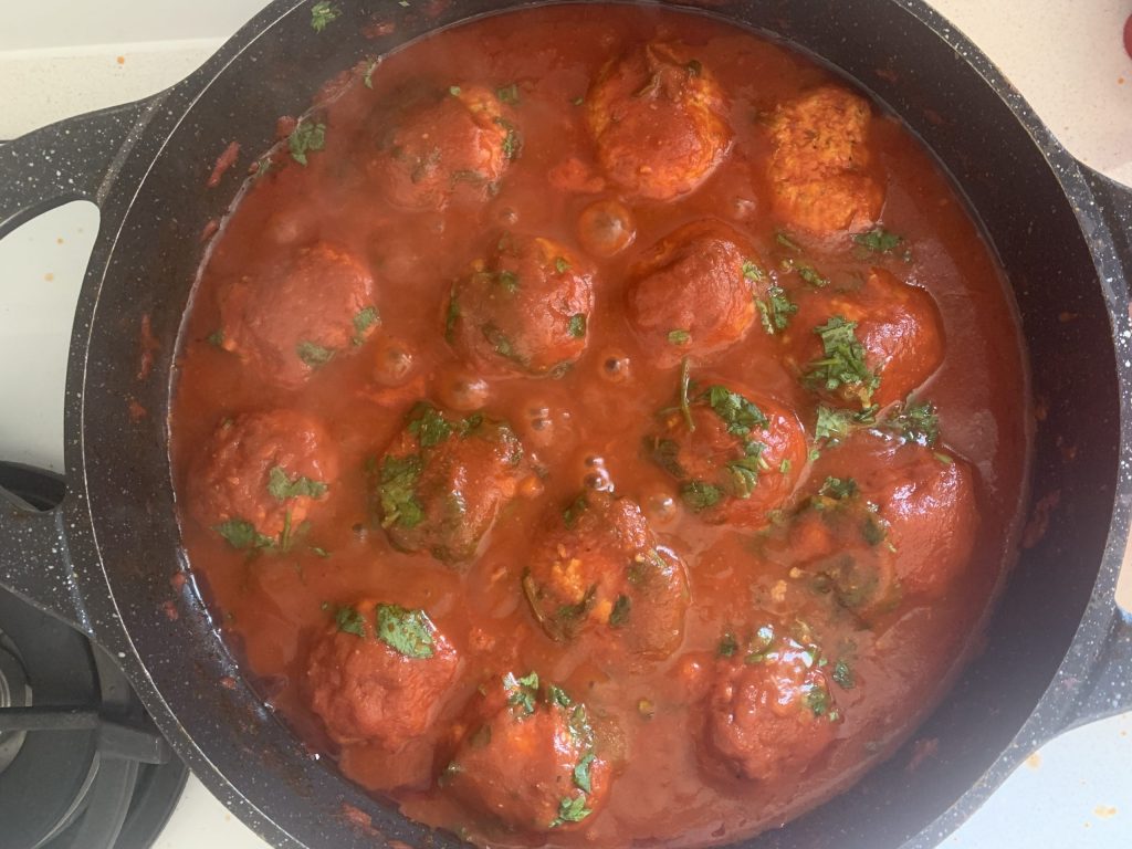 קציצות בשר ועוף ברוטב סלק. תבשיל עסיסי בצבע אדום עמוק וטעם מעט חמצמץ. אורז לבן לצידו הולך מצוין