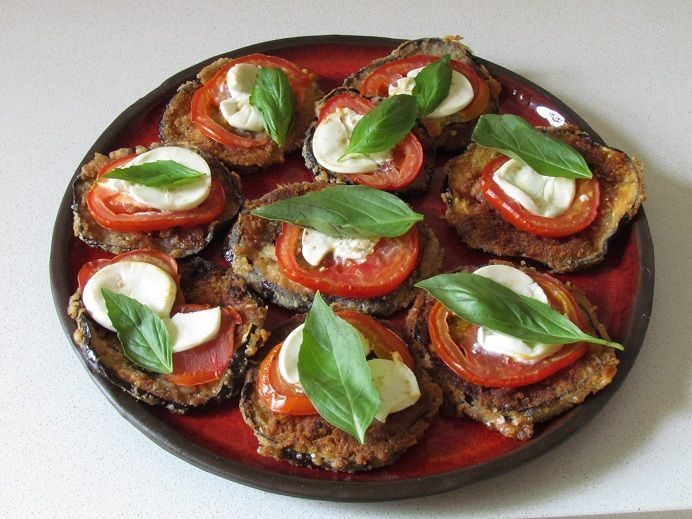 חטיף של פרוסות חצילים, עגבניות וגבינת צאן, מעוטרים בבזיליקום, אפויים וטעימים מאוד. מתאימים להגשה באירוח קוקטייל