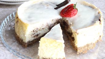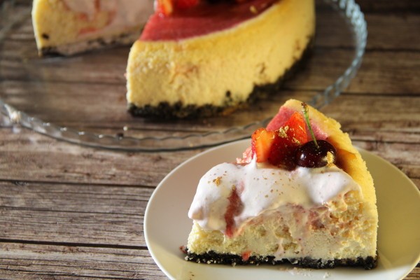 מתכון לעוגת גבינה ניו יורק אפויה, משוישת ומצופה בתותים, משולבת בגבינות שמנת וריקוטה
