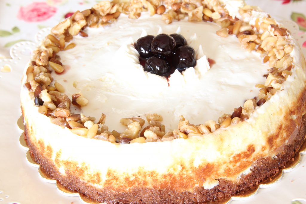 עוגת גבינה קלאסית אפויה, עם ציפוי שמנת חמוצה ועיטור של כתר דובדבני אמרנה. אין שבועות בלעדיה