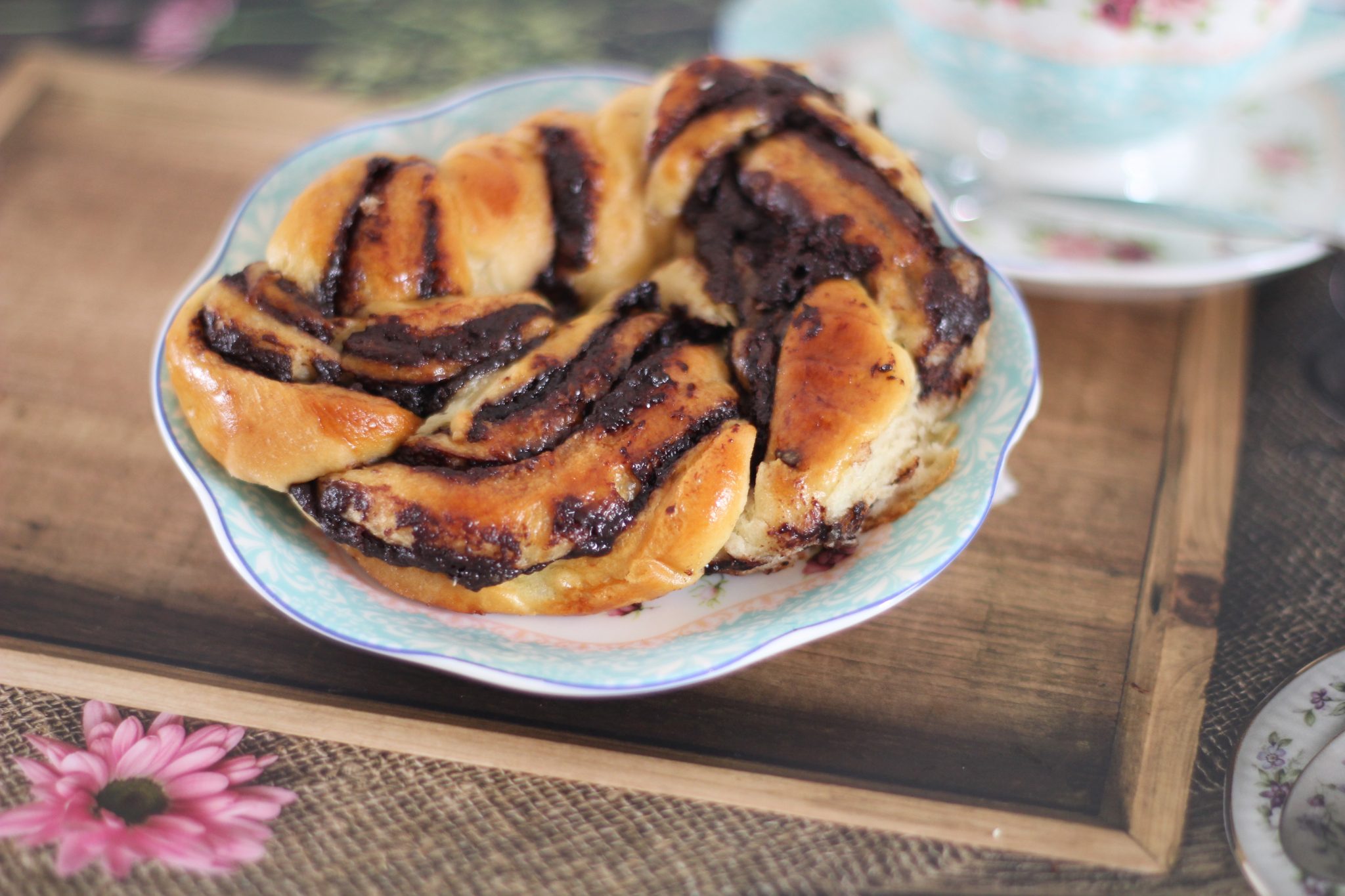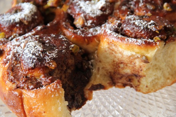 מתכון לעוגת שמרים שושנים עסיסית, במלית נוטלה, חלבה ופיסטוקים. רק לתלוש ולאכול