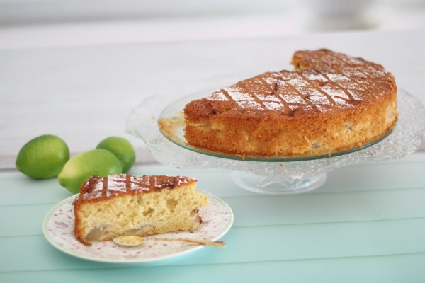 עוגה עסיסית עם פלחי אגסים רכים, גרד ומיץ של לימון ותפוז. שלא לדבר על הצבע הנהדר, הכתמתם עם נגיעות ירוקות מהליים. באפייה האגסים מתרככים מאוד