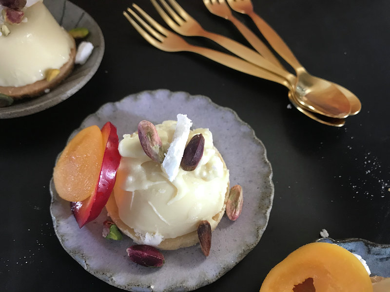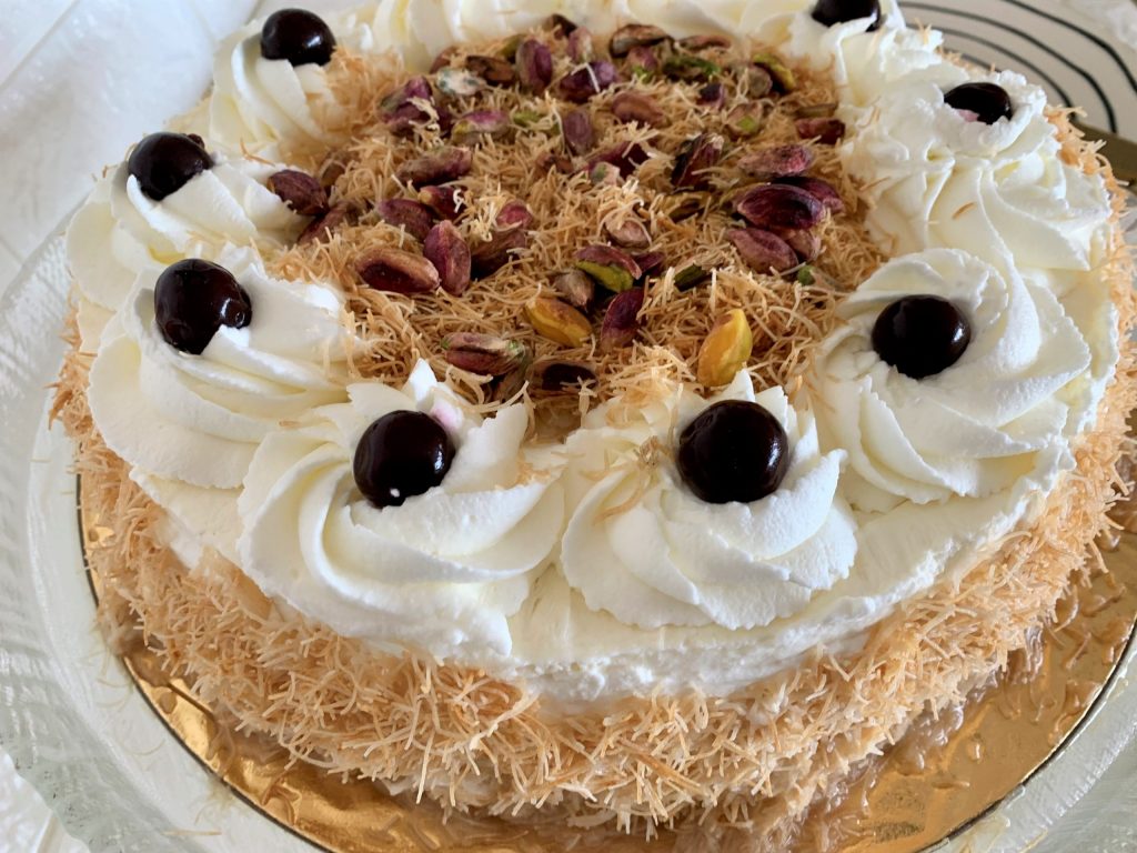 עוגת גבינה עם בסיס פריך, מוס גבינה ושוקולד לבן ומעל עיטור קראנצי של שערות קדאיף