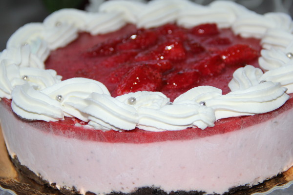 עוגת מוס גבינה משולב בתות טחון ובזיגוג מחית תותים המונח על שכבת תותים. חגיגת גבינה ותותים