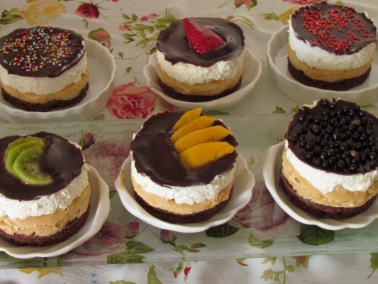 עוגות אישיות כשהבסיס עוגת שוקולד, מעל מוס ריבת חלב, מעל מוס קוקוס ומעל המוסים גנאש שוקולד, על הגנאש מעטרים בפירות וקישוטים שונים