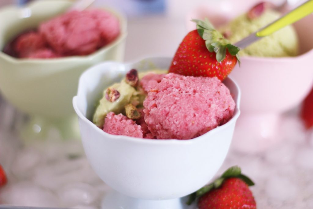 גלידת תות ופיסטוק פרווה ללא תוספת ניכרות של סוכר ומוצרי חלב, מתאימה גם לטיבעוניים